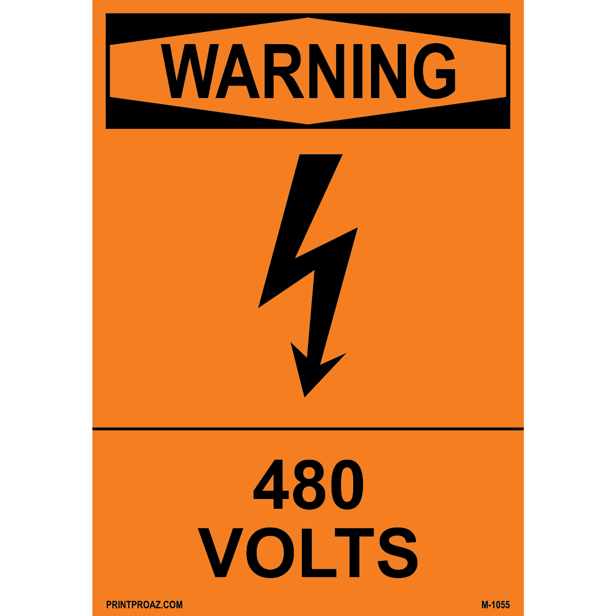 "Warning 480 volts" 0.06 inch thick Orange aluminum with Black print