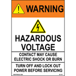 "Warning Hazardous voltage Contact may cause electric shock or burn Turn off and lock out power before servicing" 0.06 inch thick White aluminum with Black/Orange/Yellow print