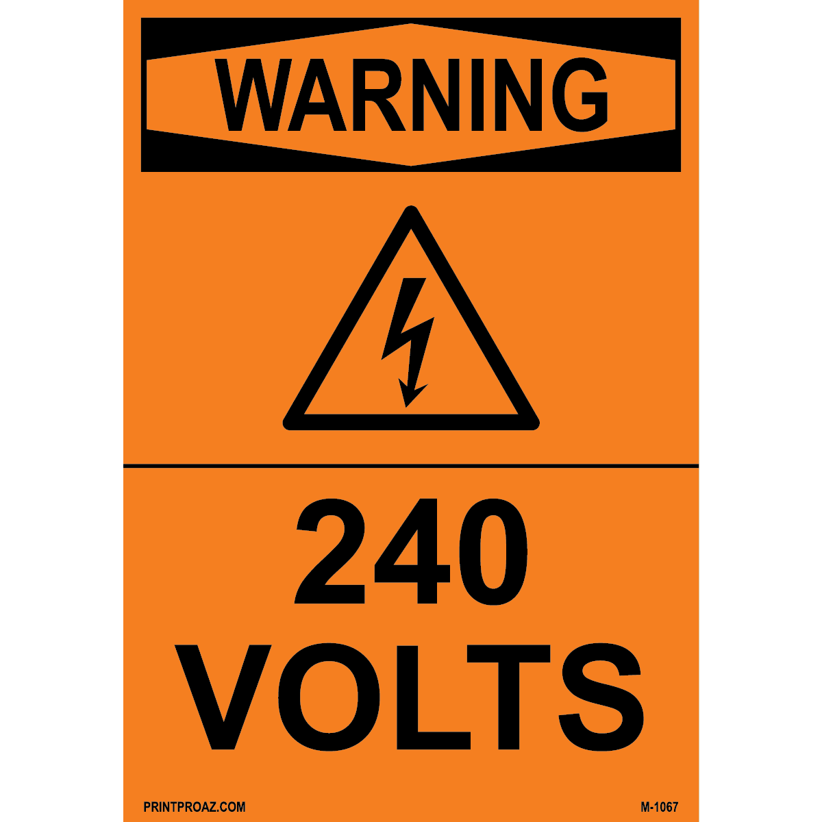"Warning 240 volts" 0.06 inch thick Orange aluminum with Black print