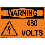 "Warning 480 volts" 0.06 inch thick Orange aluminum with Black print