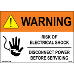 "Warning Risk of electrical shock Disconnect power before servicing" 0.06 inch thick White aluminum with Black/Orange/Yellow print