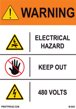 "Warning Electrical hazard Keep out 480 volts" 0.06 inch thick White aluminum with Black/Orange/Yellow print