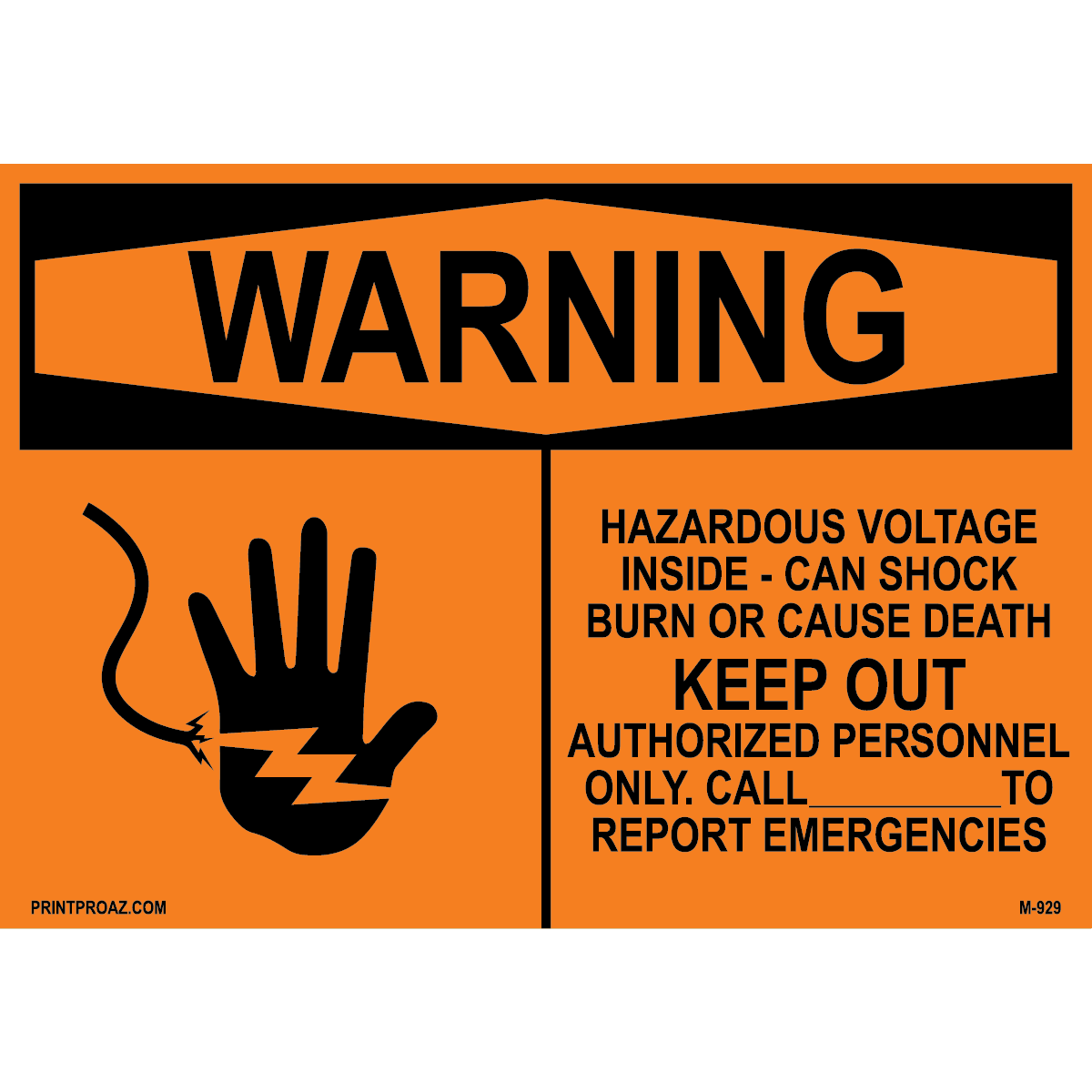 "Warning Hazardous voltage inside - can shock burn or cause death Keep out Authorized personnel only. Call " " to report emergencies" 0.06 inch thick Orange aluminum with Black print