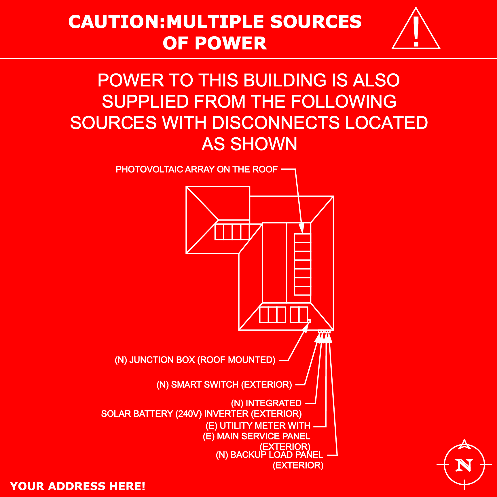 Solar arrays, MSP/combiner, disconnects, batteries, inverters, EV chargers, generators, and other major electrical equipment—laid out clearly to help prevent failed inspections.