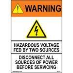 "Warning Hazardous voltage fed by two sources Disconnect all sources of power before servicing" 0.06 inch thick White aluminum with Black/Orange/Yellow print