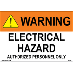 "Warning Electrical hazard Authorized personnel only" 0.06 inch thick White aluminum with Black/Orange/Yellow print