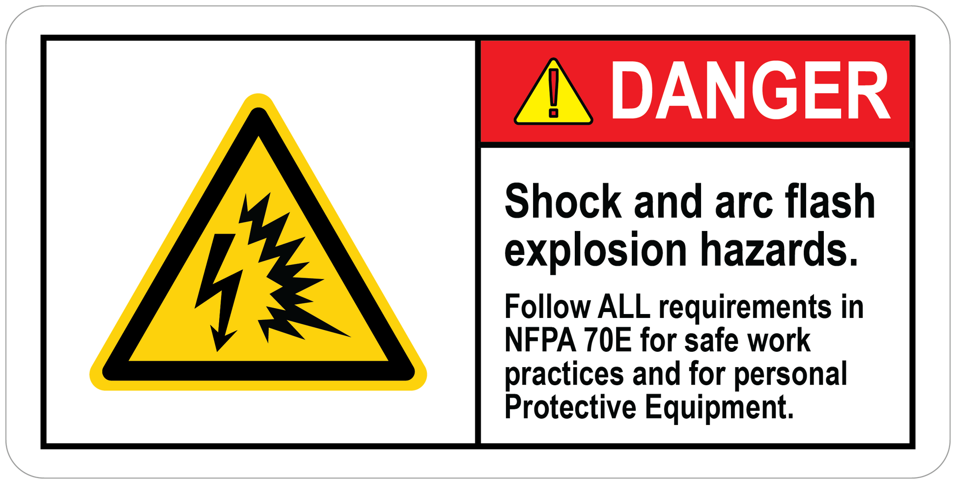 Danger Label: Shock and arc flash explosion hazards. Follow ALL requirements in NFPA 70E for safe work practices and for Personal Protective Equipment. Safety Labels are not all created equally. Compare our labels with the competition and notice how our improved artwork and design give you a label with greater impact and more staying power. Safety should not be an afterthought or a secondary concern - make sure that you take advantage of every opportunity to remind workers about safe workplace tactics. Labels make it easy to put powerful reminders in all the right places. Our Labels are available in several different materials, giving you the power to balance between your needs for cost-effectiveness and durability. A range of size options gives you freedom to place these labels in any type of setting, as well, from on a machine itself to on a wall or on a product. Safety comes first when you use a label - labels make it easy to talk about safety often.