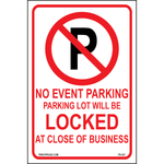 "No Event Parking Parking Lot will be Locked at Close of Business" Red/White/Black Print on Aluminum