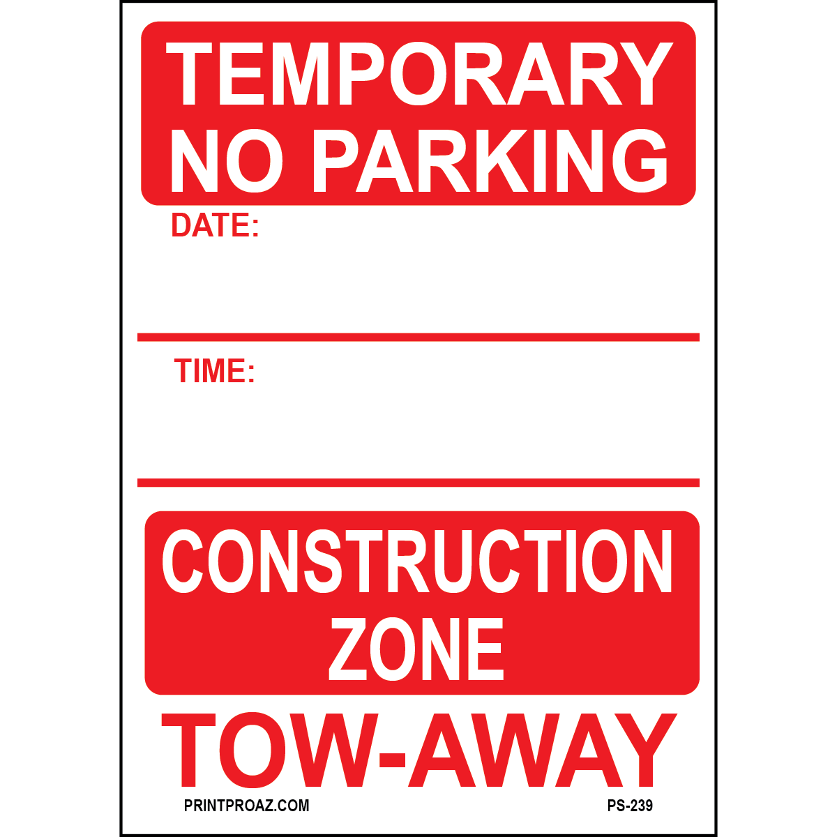 "Temporary No Parking Signs" Red/White Print on Aluminum