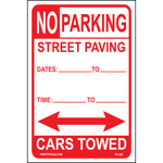 "Temporary No Parking Street Paving Cares Towed Signs" Red/White Print on Aluminum