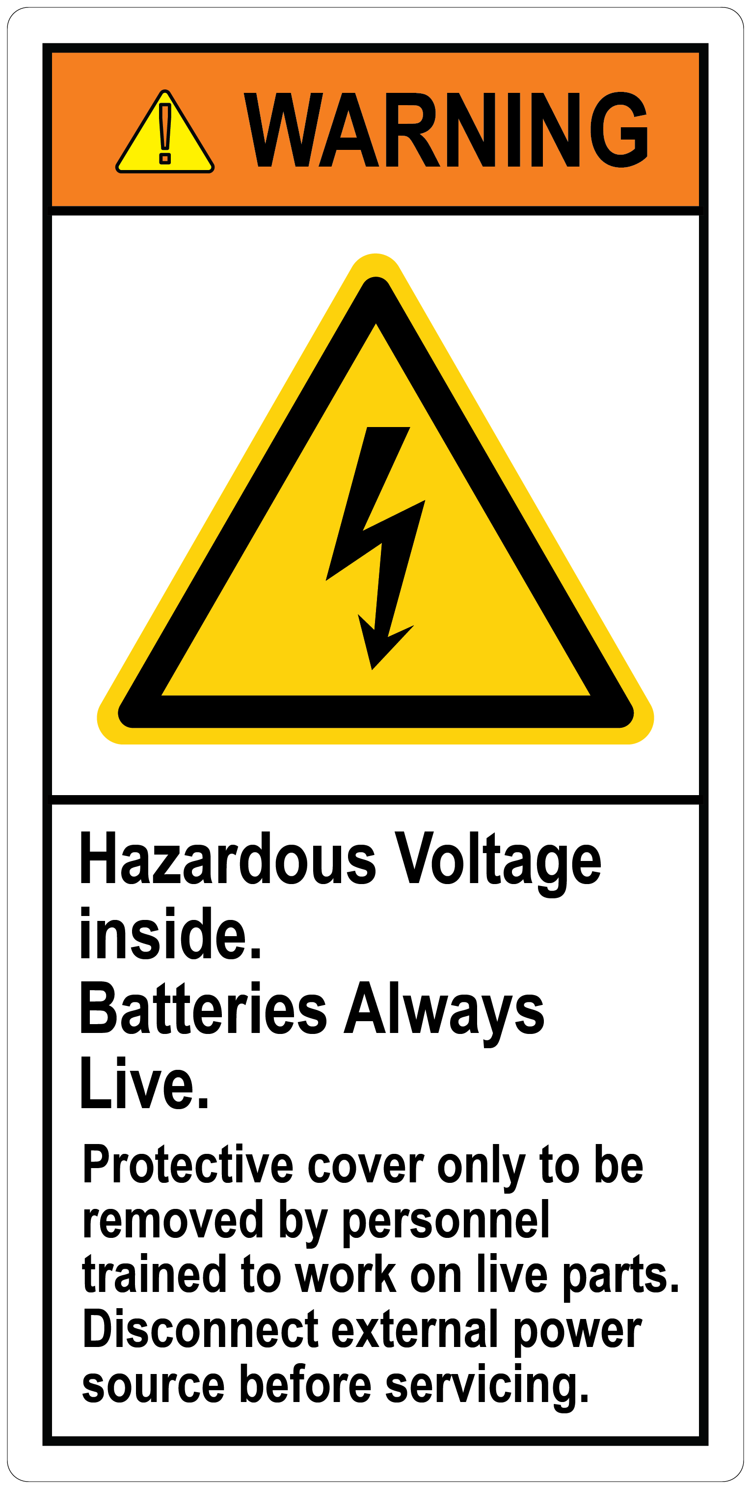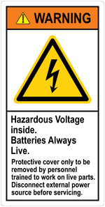 ANSI Warning Label: Hazardous Voltage Inside, Batteries Always Live, Protective Cover Only To Be Removed By Personnel Trained