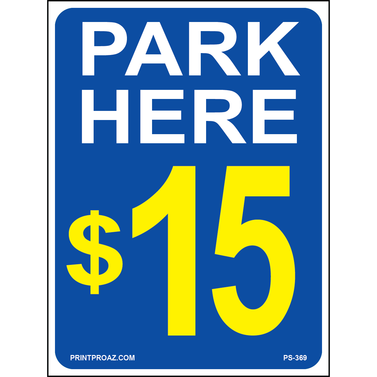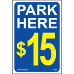 "Park Here $15 Sign" Blue/Yellow/White Print on Aluminum