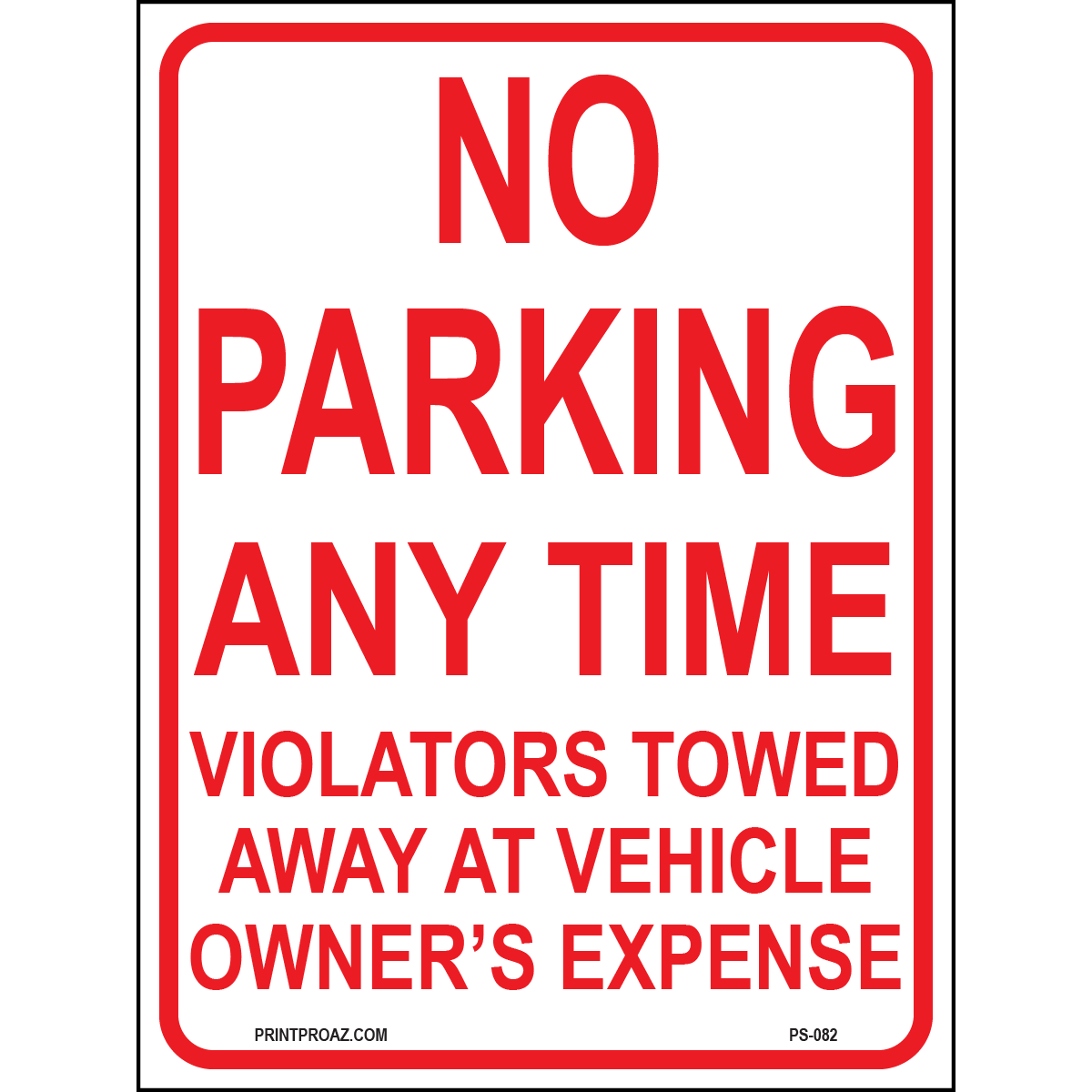 "No Parking Any Time Violators Towed Away at Vehicle Owner's Expense" Red/White/Black Print on Aluminum