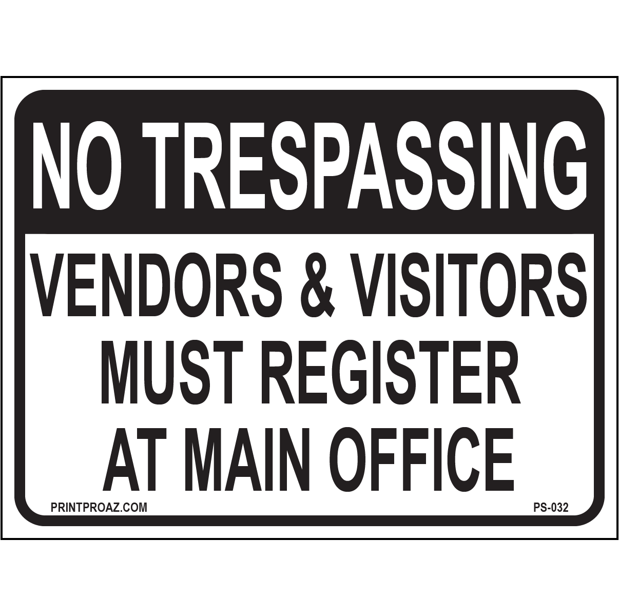 "No Trespassing Vendors & Visitors must Register at Main Office" Red/White/Black Print on Aluminum