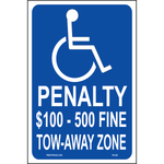 "Virginia Accessible Tow Away Zone Penalty Sign" Blue/White/Black Print on Aluminum