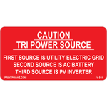 "Caution Tri Power Source First source is utility electric grid Second source is AC battery Third source is PV inverter" Red Decal with White print