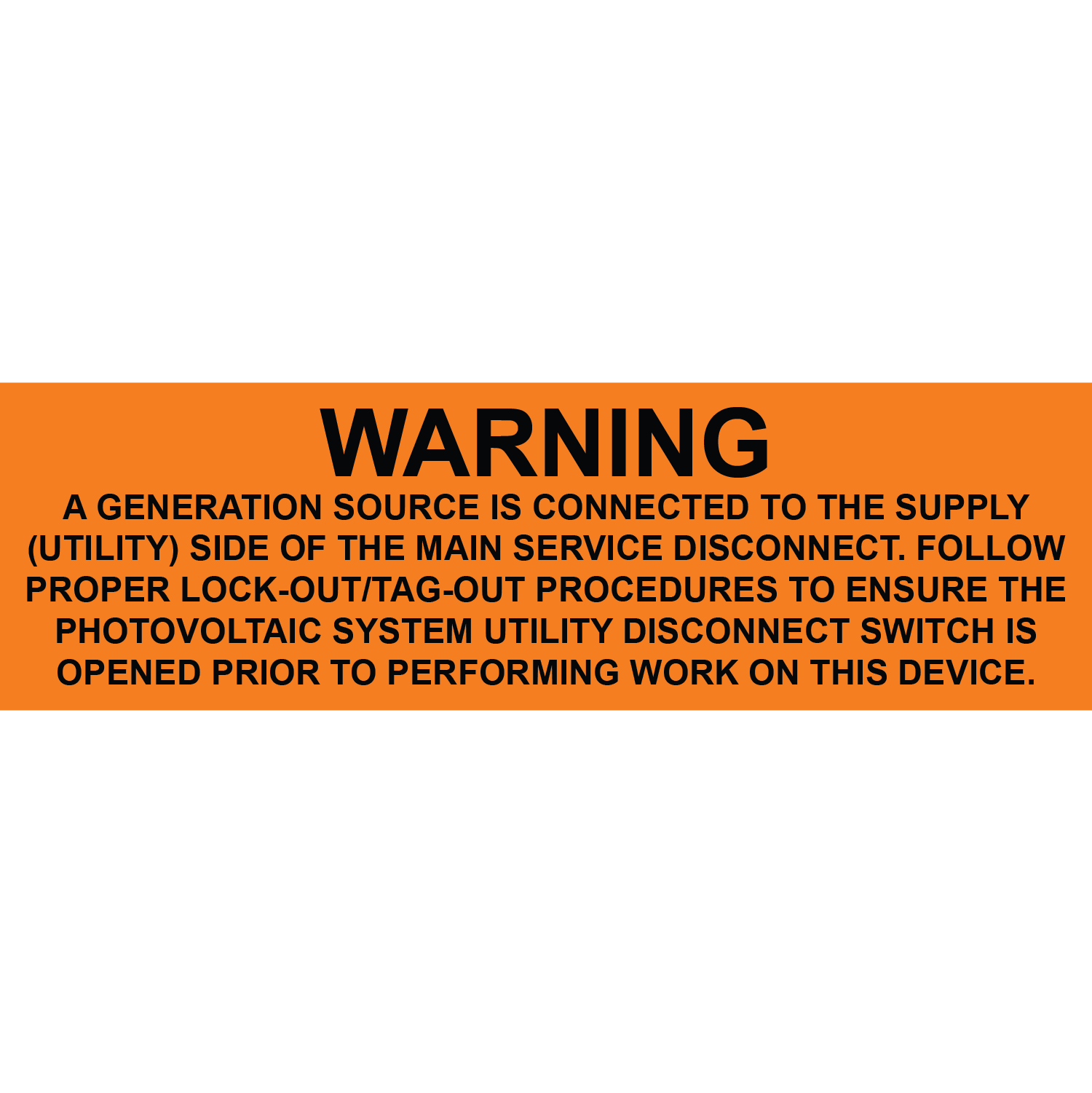 Protect your solar energy systems with this high-visibility and NEC Compliant Warning A Generation Source is Connected to the Supply label. Featuring orange background and black print, this durable plastic tag clearly states: