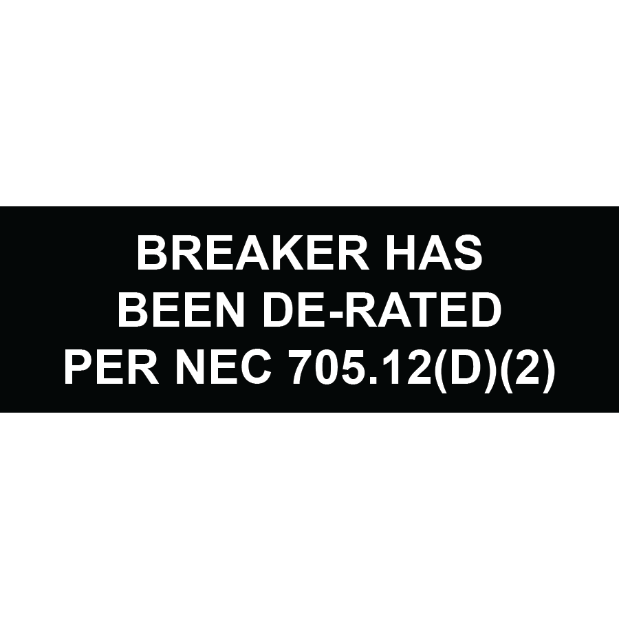 Protect your solar energy systems with this high-visibility and NEC Compliant Breaker Has Been De-Rated Per NEC 705.12(D)(2) label. Featuring black background and white print, this durable plastic tag clearly states: