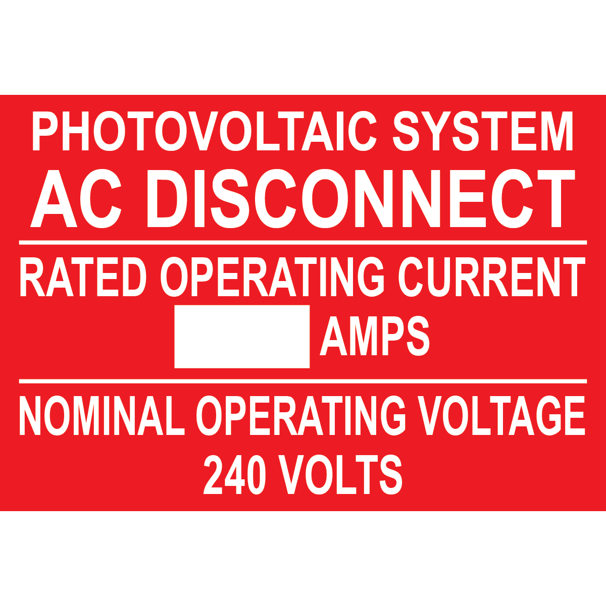 Protect your solar energy systems with this high-visibility and NEC Compliant Photovoltaic System AC disconnect label. Featuring bold red and white print, this durable plastic tag clearly states: