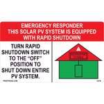 "Emergency responder This solar PV system is equipped with rapid shutdown Turn rapid shutdown switch to the "off" position to shut down entire PV system." Decal with White/Black/Red/Green/Yellow print