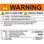 Warning Arc Flash Hazard and Shock Risks label with 12 input fields for arc flash data, shock risks, PPE, risk category, and boundary distances