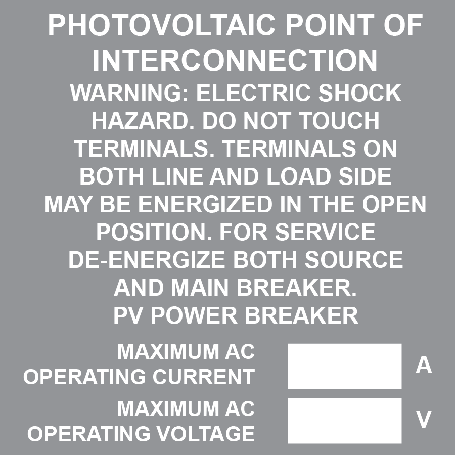 Protect your solar energy systems with this high-visibility and NEC Compliant Photovoltaic Point of Interconnection label. Featuring gray background and white print, this durable plastic tag clearly states: