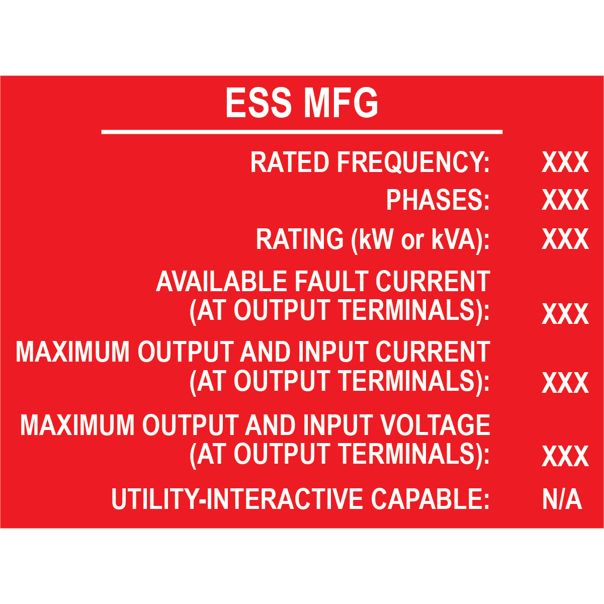 Protect your solar energy systems with this high-visibility and NEC Compliant Custom ESS MFG label. Featuring bold red and white print, this durable plastic tag clearly states: