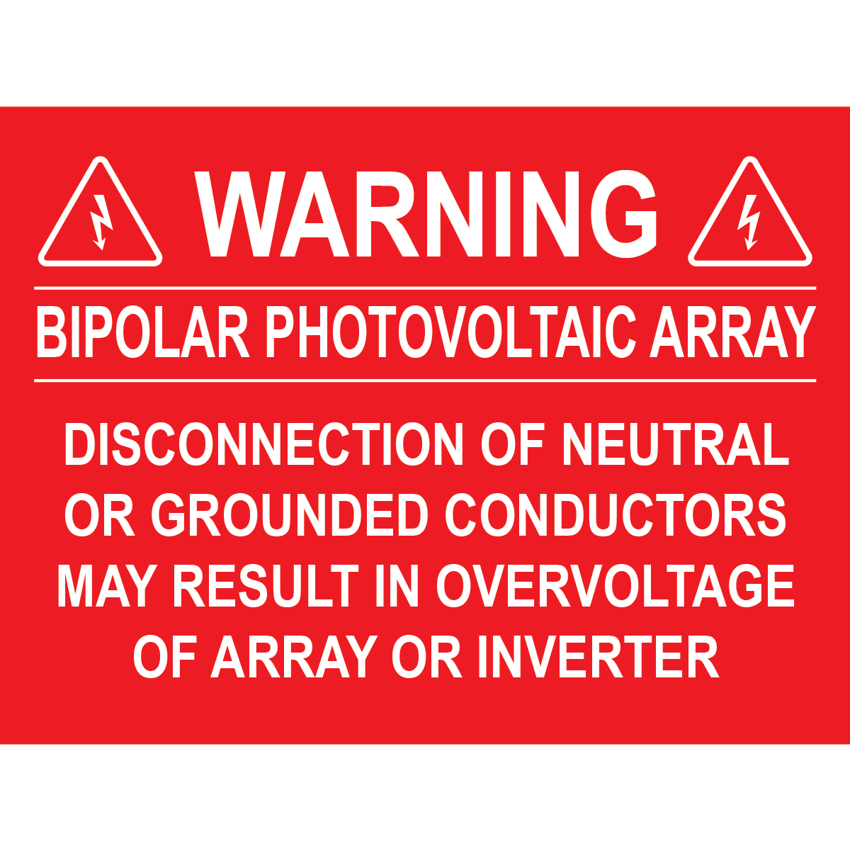 Protect your solar energy systems with this high-visibility and NEC Compliant Warning Bipolar Photovoltaic Array label. Featuring bold red and white print, this durable plastic tag clearly states: