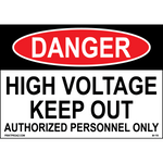 "Danger High voltage Keep out Authorized personnel only" 0.06 inch thick White aluminum with Red/Black print