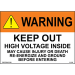 "Warning Keep out High voltage inside May cause injury or death Re-energize and ground before entering" 0.06 inch thick White aluminum with Black/Orange/Yellow print