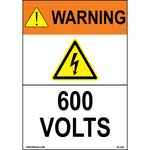"Warning 600 volts" 0.06 inch thick White aluminum with Black/Orange/Yellow print