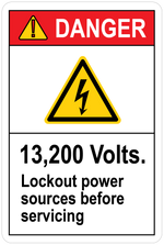 ANSI Danger High Voltage Label: 13,200 Volts - Lockout Power Sources Before Servicing (Electric Shock Symbol)